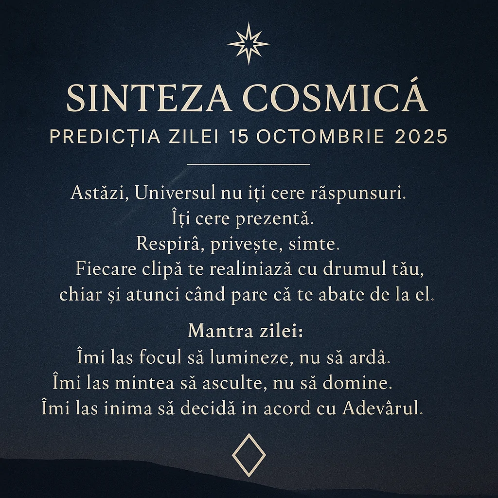 Predicția zilei – 15 octombrie 2025, un articol-sinteză care împletește astrologie, tarot, numerologie, calendar mayas, bioritm, horoscop vedic, rune, zodiac celtic, horoscop chinezesc, Human Design și I Ching