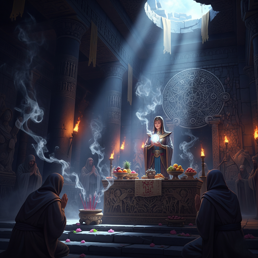 - Locație sacră: Un templu dedicat, decorat cu simboluri sacre, cu toate elementele necesare pentru a crea o atmosferă de reverență și înălțare spirituală.